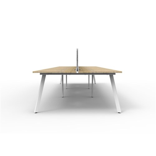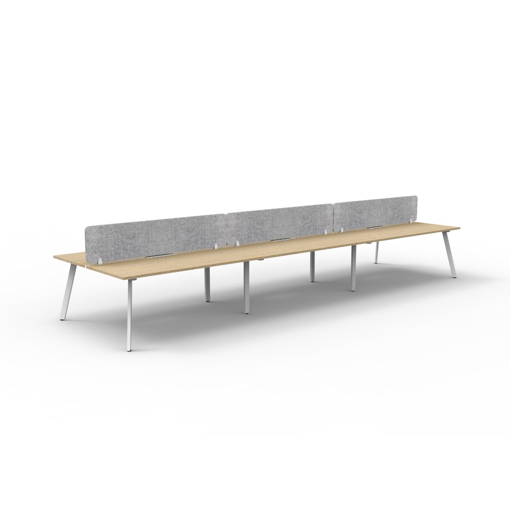 6 person double sided workstation with Natural Oak top and White Satin frame, Grey Eco screen.