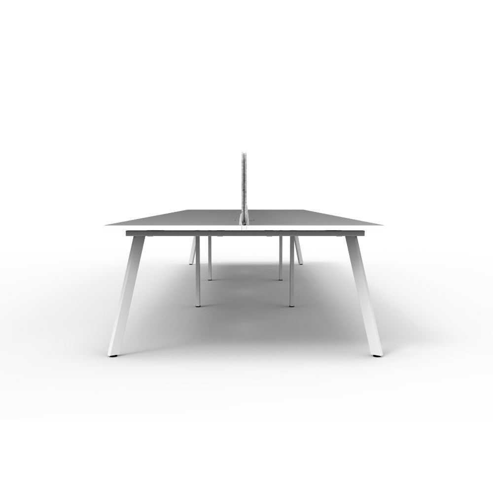 6 person double sided workstation with Natural White top and White Satin frame, Grey Eco screen.