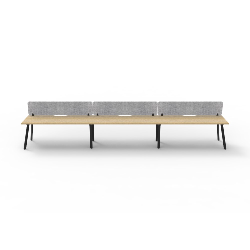 3 person single sided workstation with Natural Oak top and Black Satin frame, Grey Eco screen.