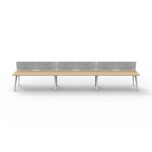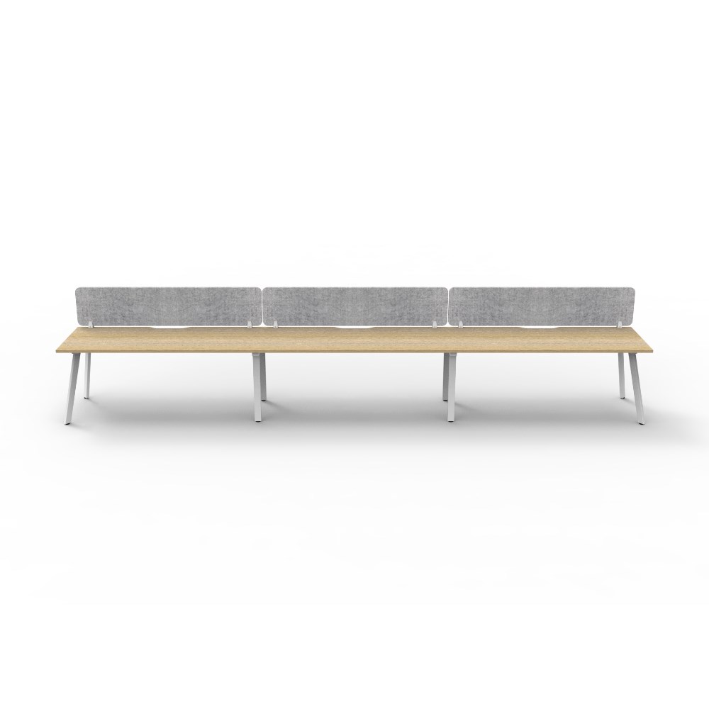 3 person single sided workstation with Natural Oak top and White Satin frame, Grey Eco screen.