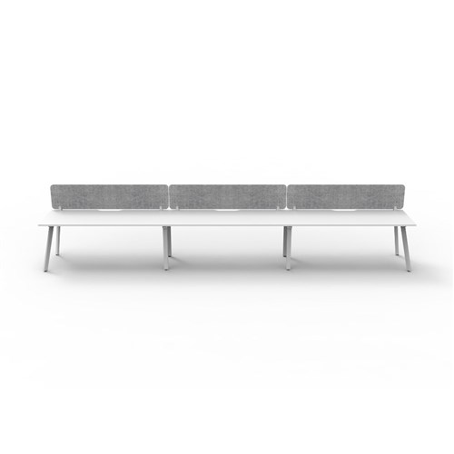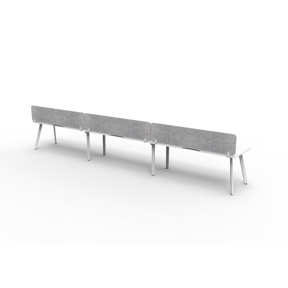 3 person single sided workstation with Natural White top and White Satin frame, Grey Eco screen.