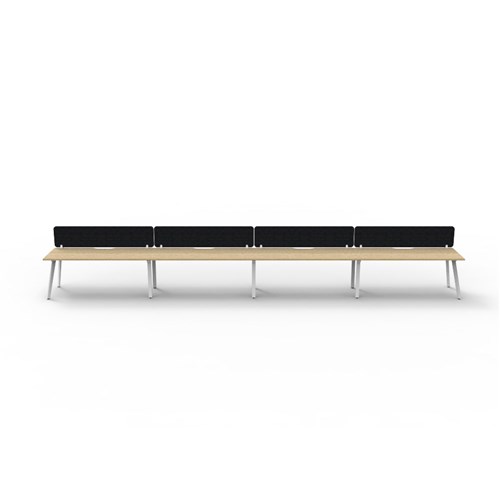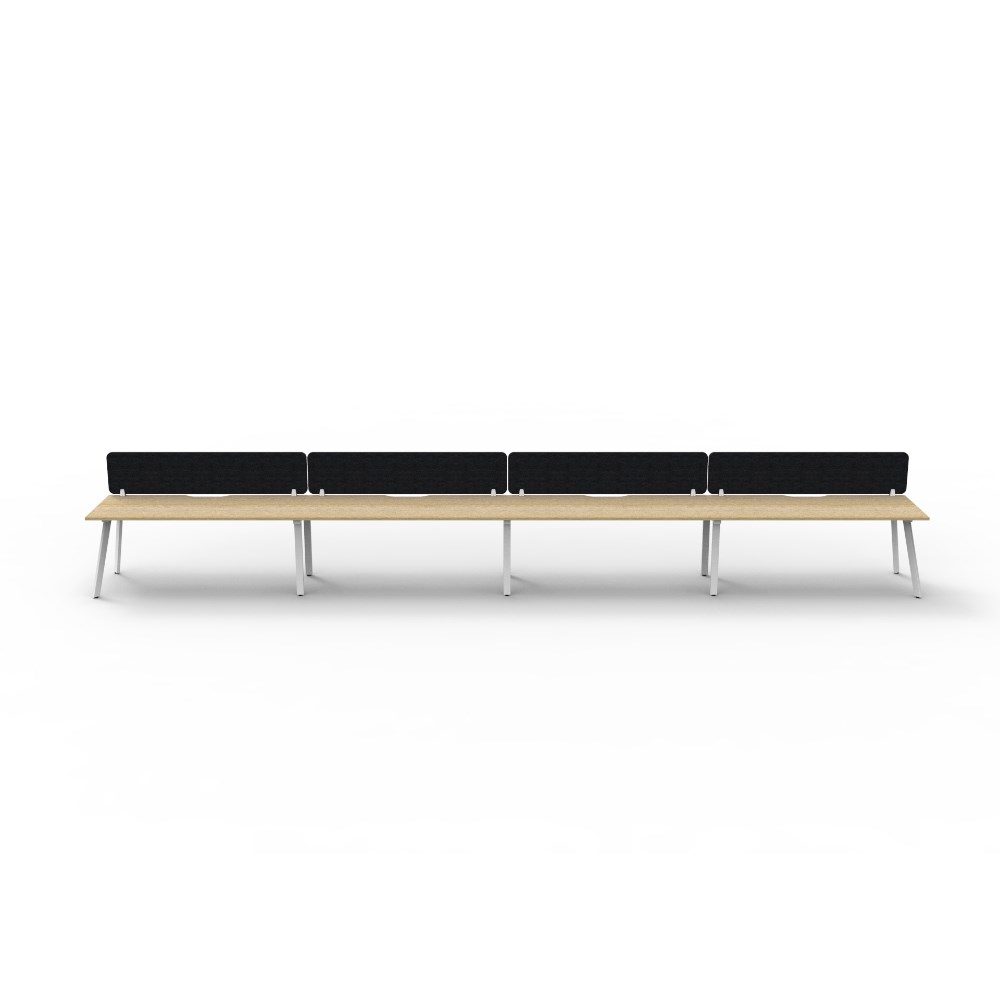4 person single sided workstation with Natural Oak top and White Satin frame, Black Eco screen.