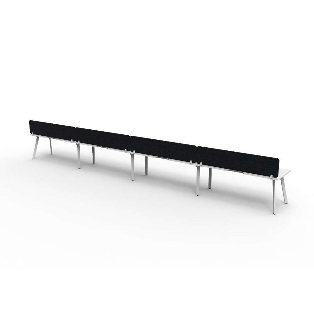 4 person single sided workstation with Natural White top and White Satin frame, Black Eco screen.
