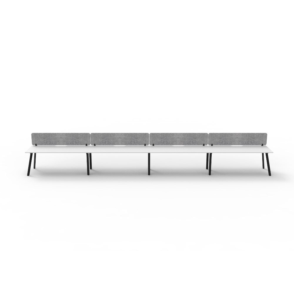 4 person single sided workstation with Natural White top and Black Satin frame, Grey Eco screen.