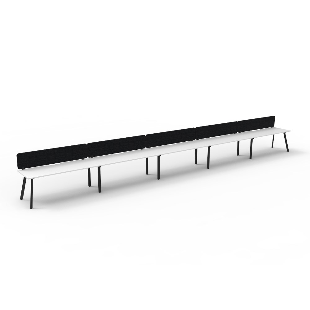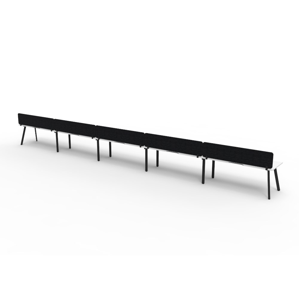 5 person single sided workstation with Natural White top and Black Satin frame, Black Eco screen.