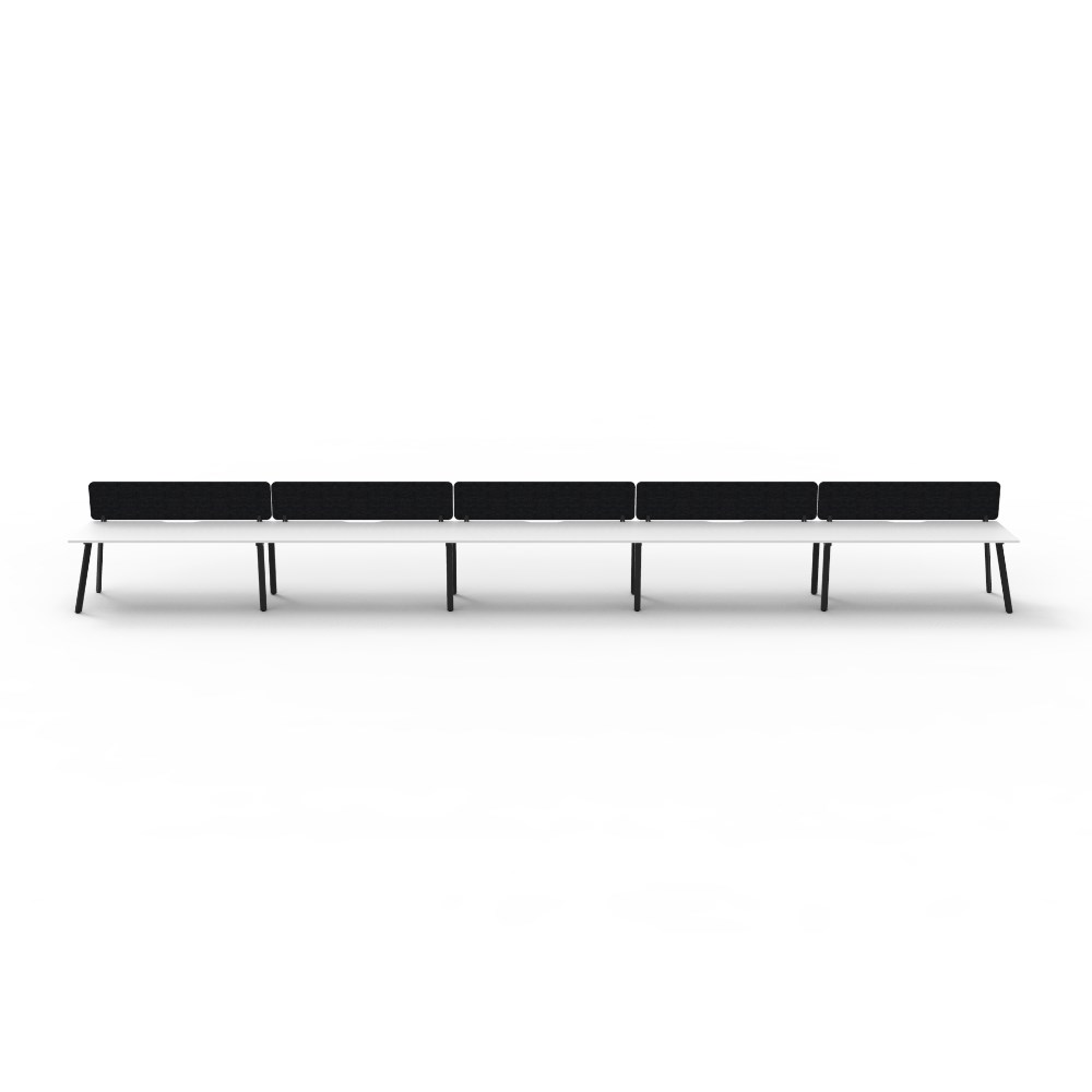 5 person single sided workstation with Natural White top and Black Satin frame, Black Eco screen.