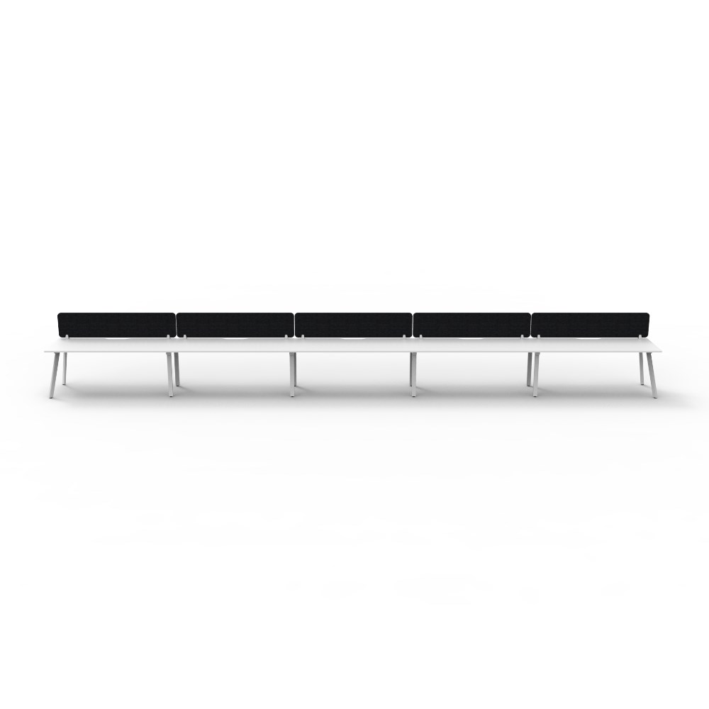 5 person single sided workstation with Natural White top and White Satin frame, Black Eco screen.