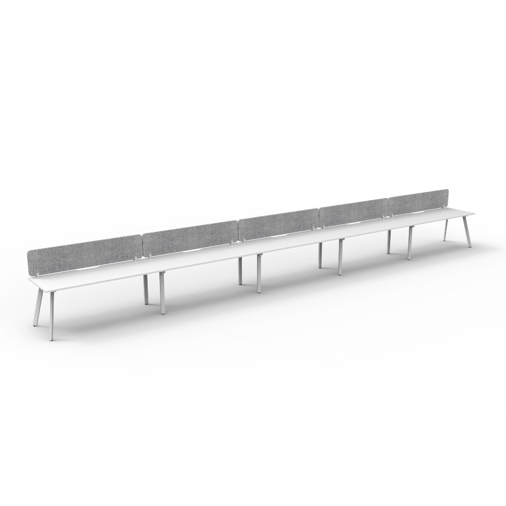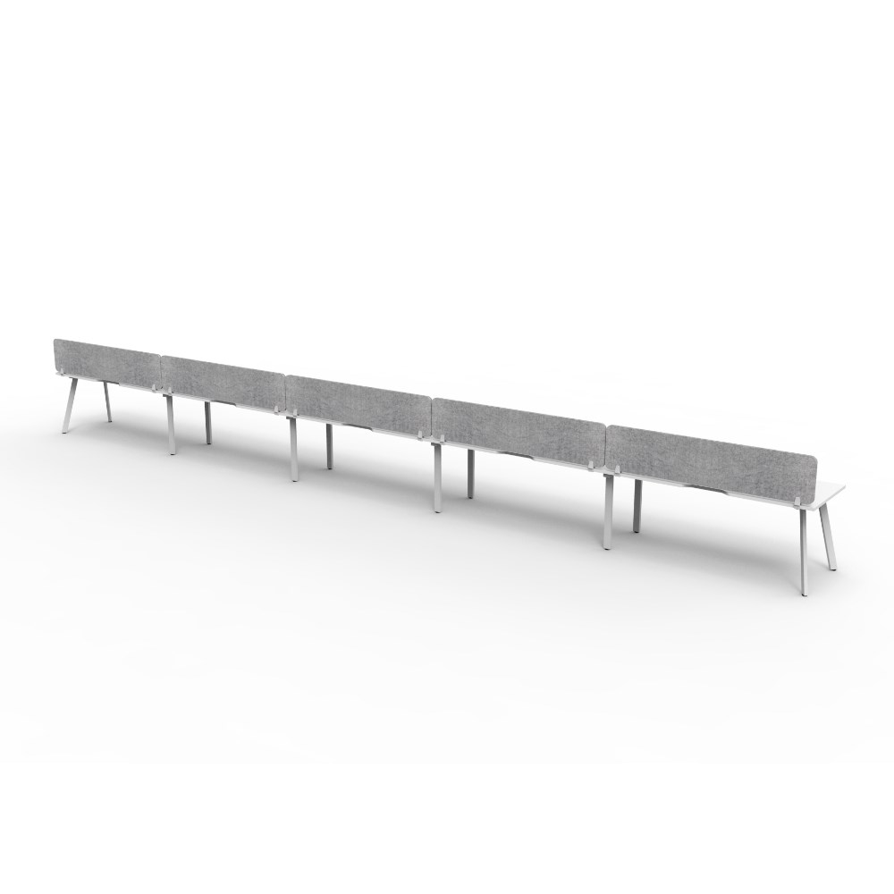 5 person single sided workstation with Natural White top and White Satin frame, Grey Eco screen.