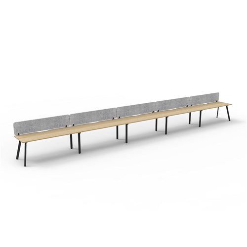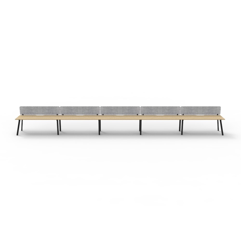 5 person single sided workstation with Natural Oak top and Black Satin frame, Grey Eco screen.