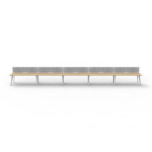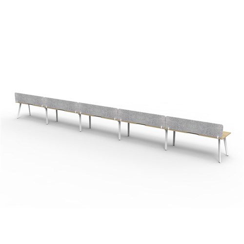 5 person single sided workstation with Natural Oak top and White Satin frame, Grey Eco screen.