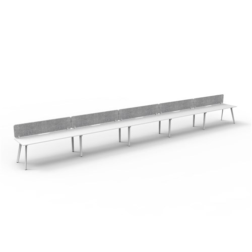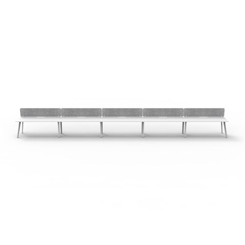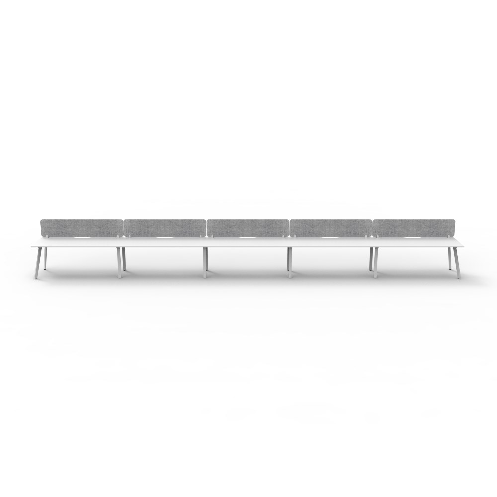 5 person single sided workstation with Natural White top and White Satin frame, Grey Eco screen.