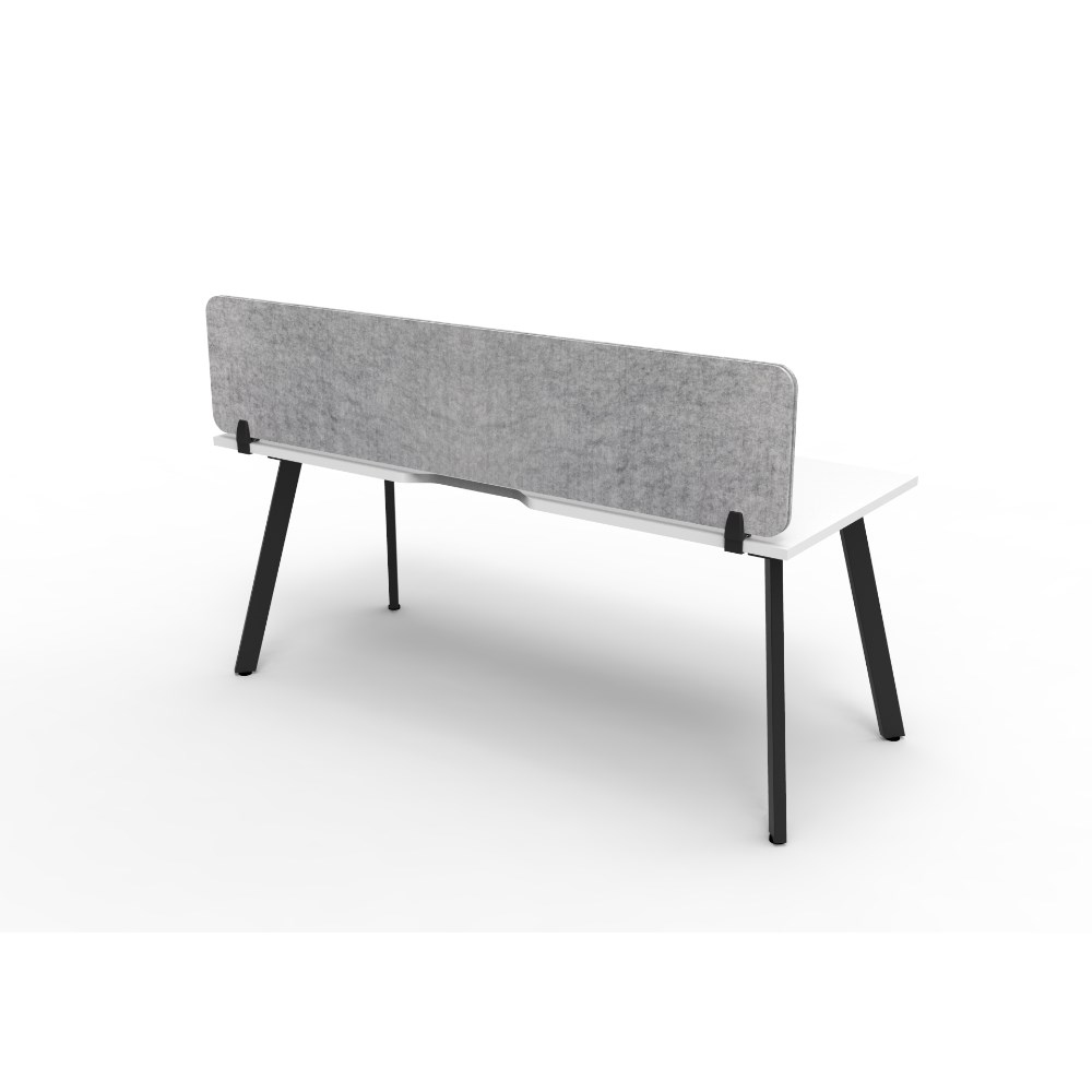 Natural White worksurface with rigid edging and 410mmW x 50mmD scallop cable access. Black Satin powder coat frame. Eco screen.
