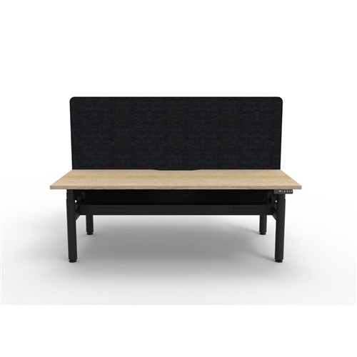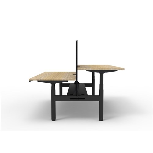 Electric height adjustable 2 person back to back workstation with Natural Oak top and Black Satin frame, Black Eco screen and cable tray.