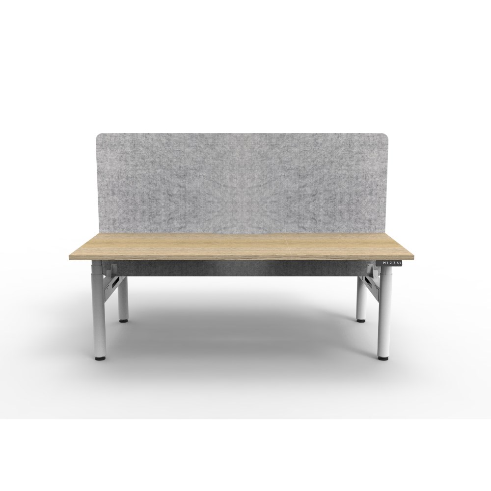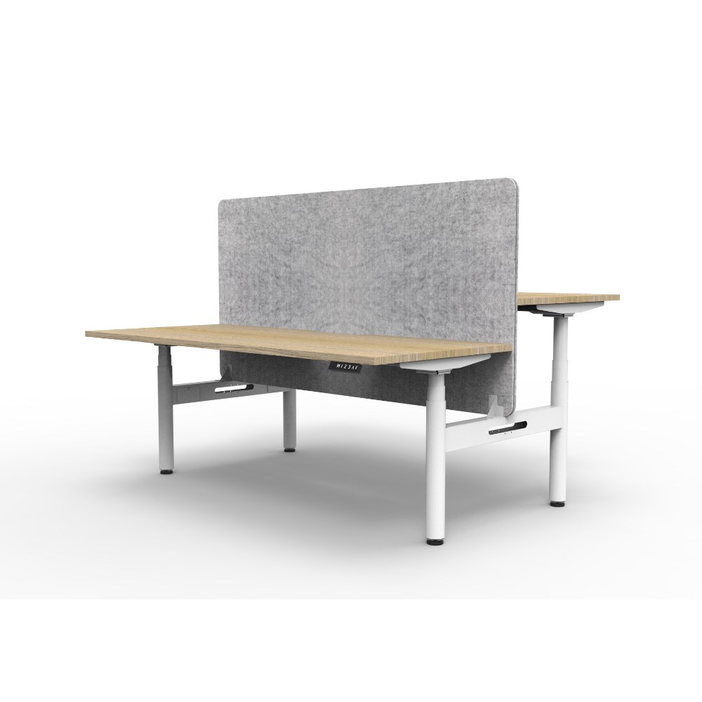 Electric height adjustable 2 person back to back workstation with Natural Oak top and White Satin frame, Grey Eco screen.