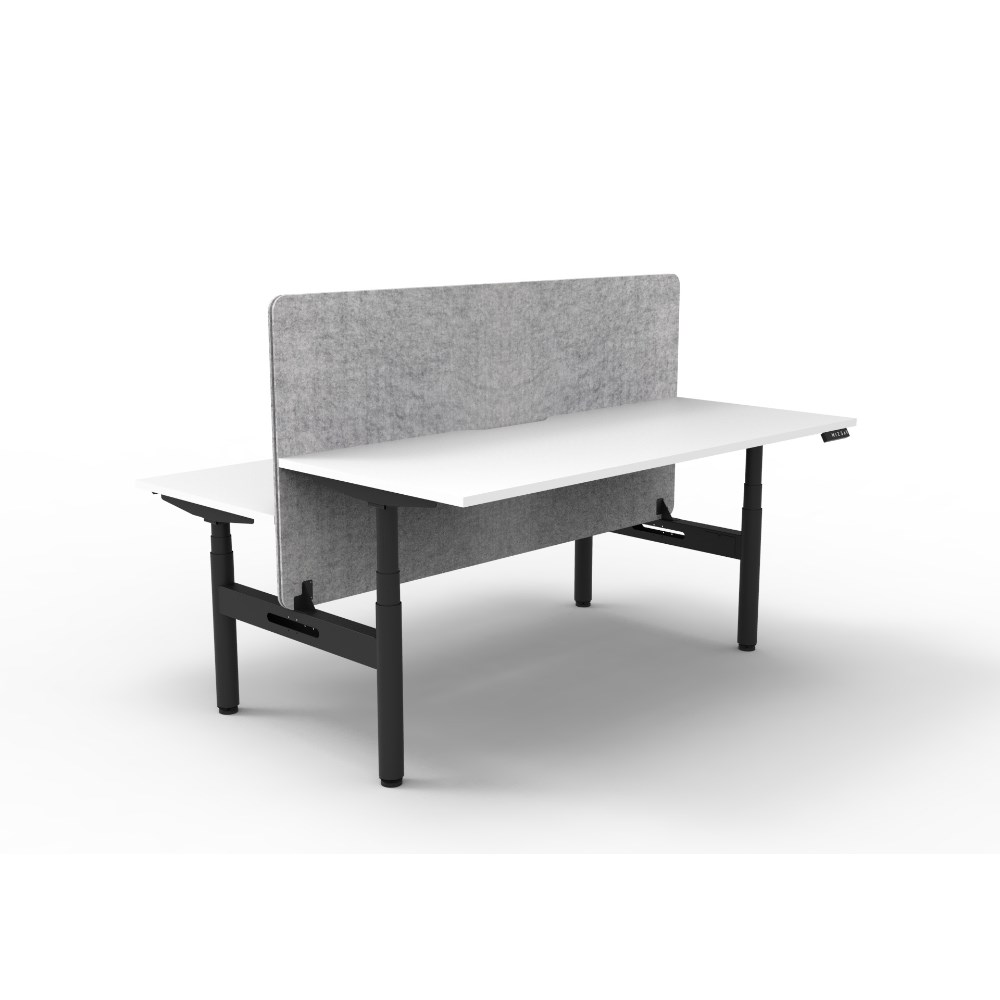 Electric height adjustable 2 person back to back workstation with White top and Black Satin frame, Grey Eco screen.