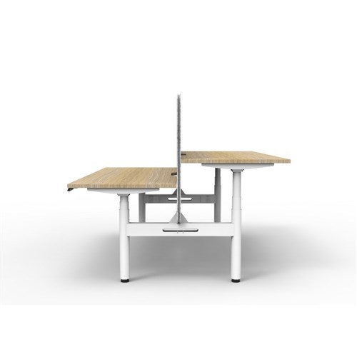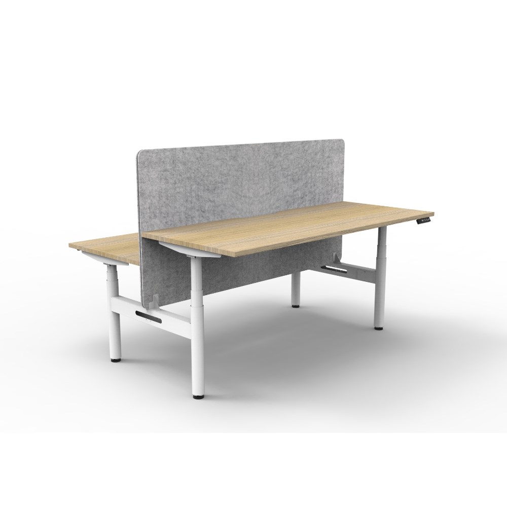 Electric height adjustable 2 person back to back workstation with Natural Oak top and White Satin frame, Grey Eco screen.