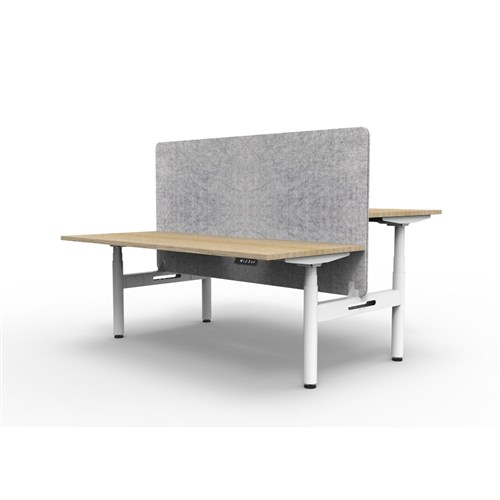 Electric height adjustable 2 person back to back workstation with Natural Oak top and White Satin frame, Grey Eco screen.