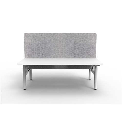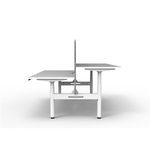 Electric height adjustable 2 person back to back workstation with White top and White Satin frame, Grey Eco screen.
