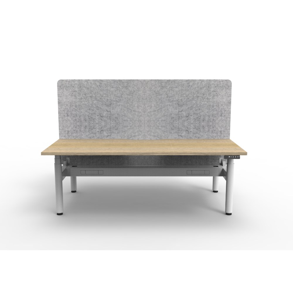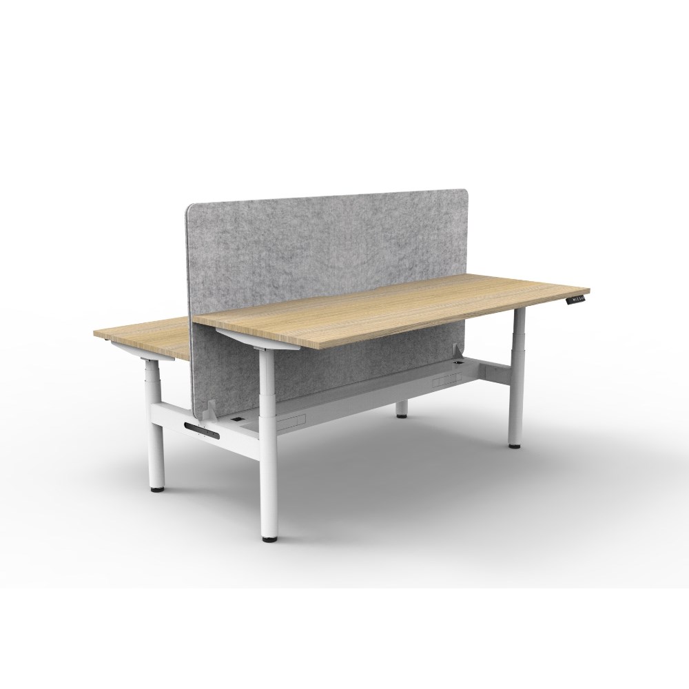 Electric height adjustable 2 person back to back workstation with Natural Oak top and White Satin frame, Grey Eco screen and cable tray.