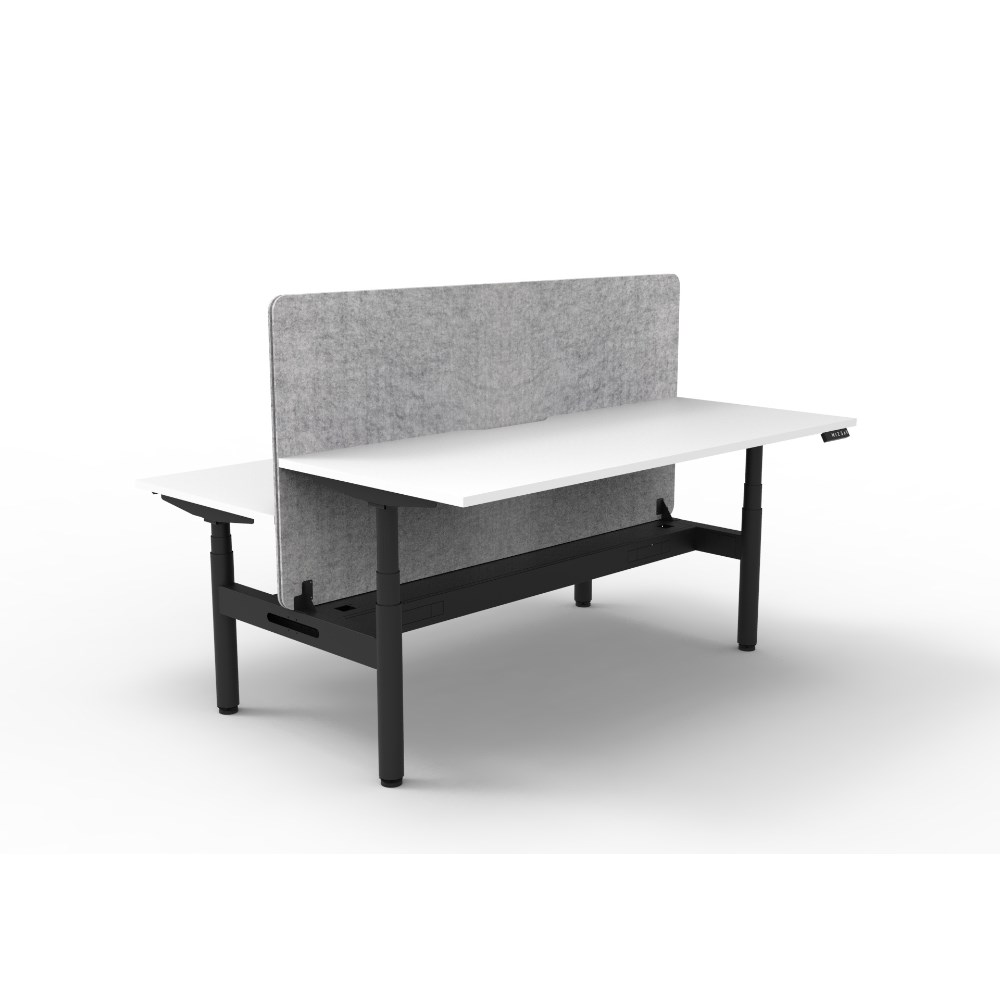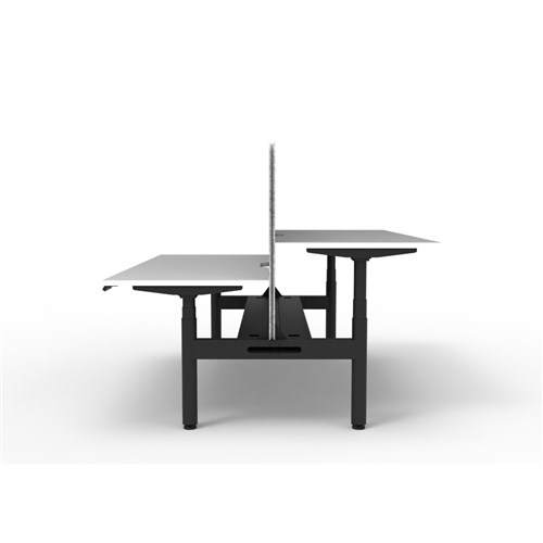 Electric height adjustable 2 person back to back workstation with White top and Black Satin frame, Grey Eco screen and cable tray.