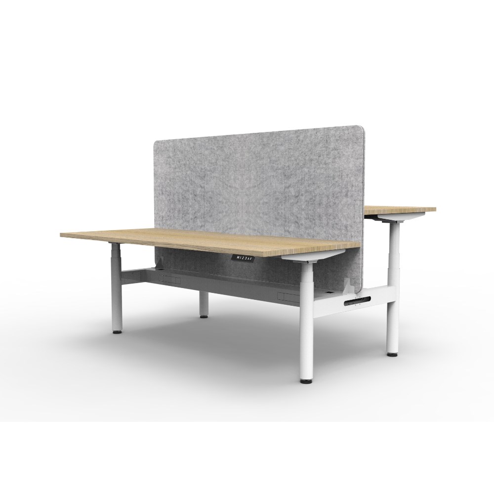 Electric height adjustable 2 person back to back workstation with Natural Oak top and White Satin frame, Grey Eco screen and cable tray.
