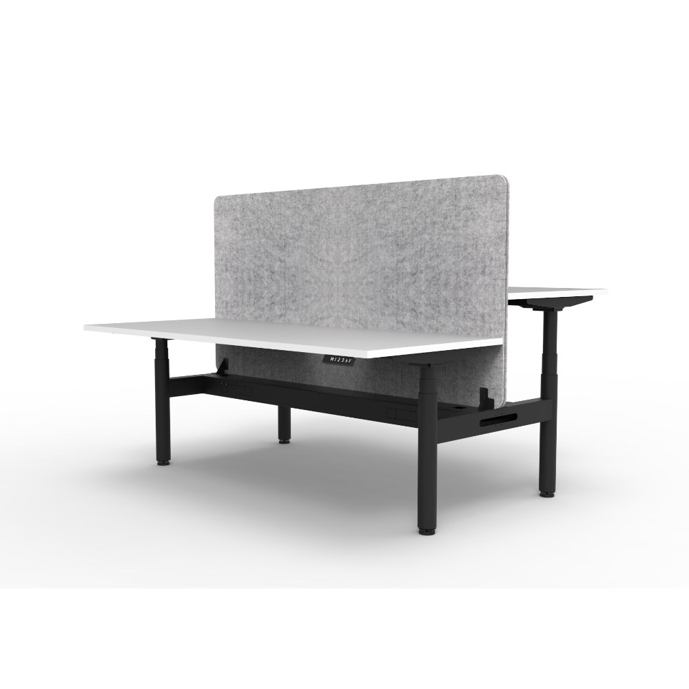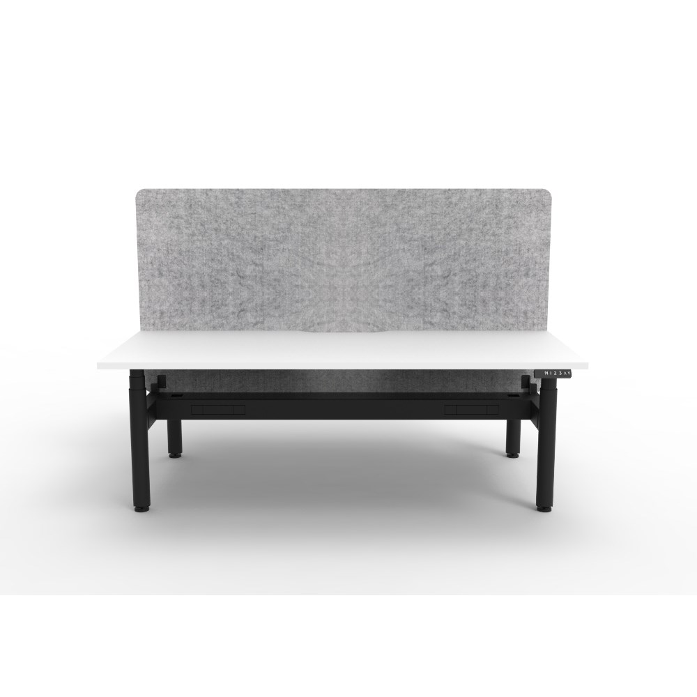 Electric height adjustable 2 person back to back workstation with White top and Black Satin frame, Grey Eco screen and cable tray.