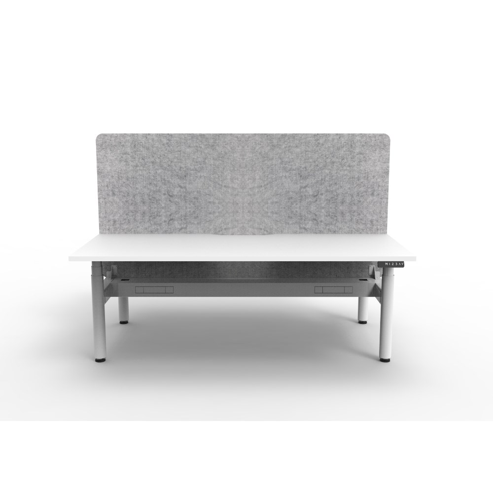 Electric height adjustable 2 person back to back workstation with White top and White Satin frame, Grey Eco screen and cable tray.