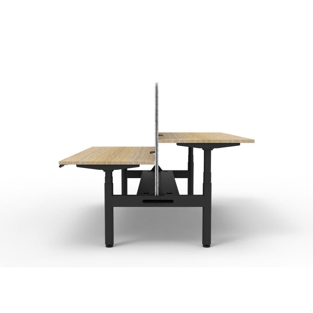 Electric height adjustable 2 person back to back workstation with Natural Oak top and Black Satin frame, Grey Eco screen and cable tray.