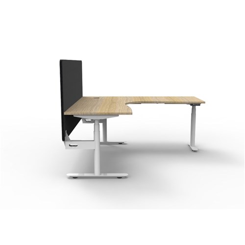 Electric height adjustable corner workstation with Natural Oak top and White Satin frame, Black Eco screen.