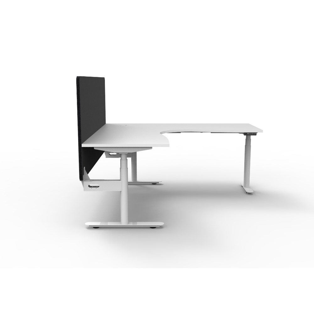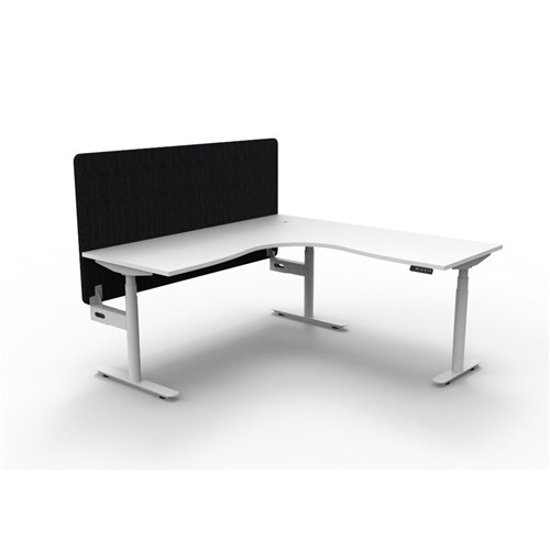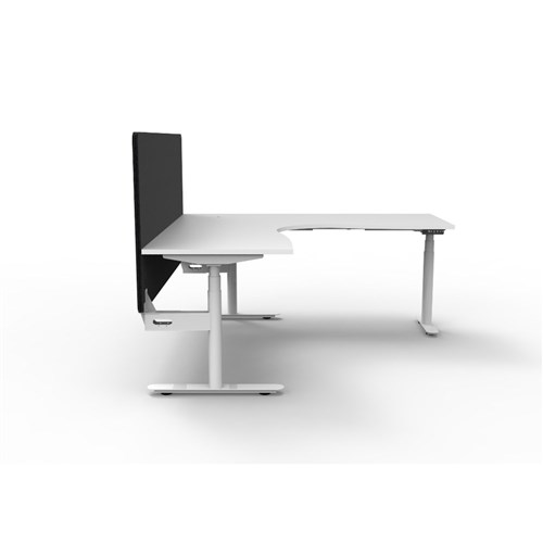 Electric height adjustable corner workstation with White top and White Satin frame, Black Eco screen.