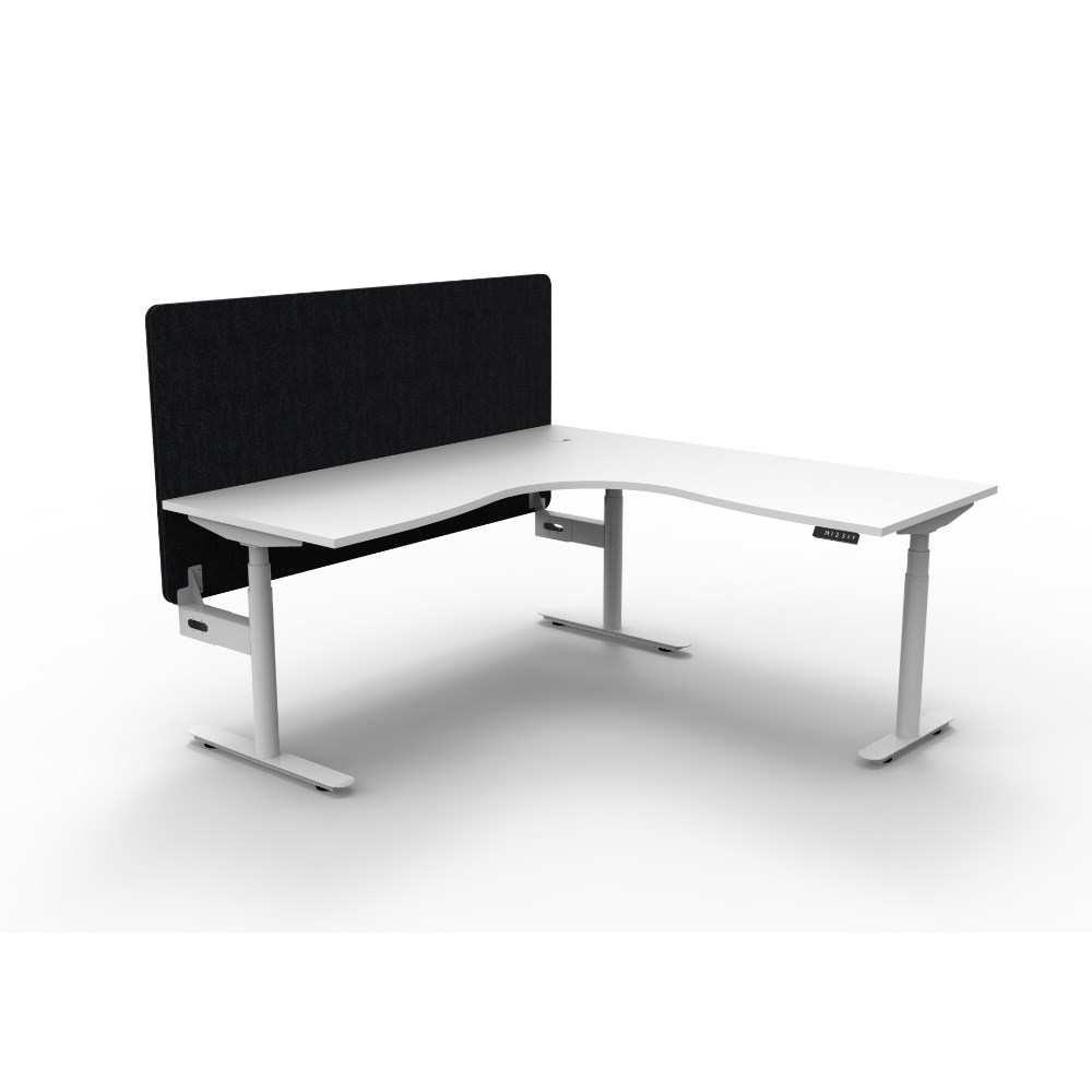 Electric height adjustable corner workstation with White top and White Satin frame, Black Eco screen.