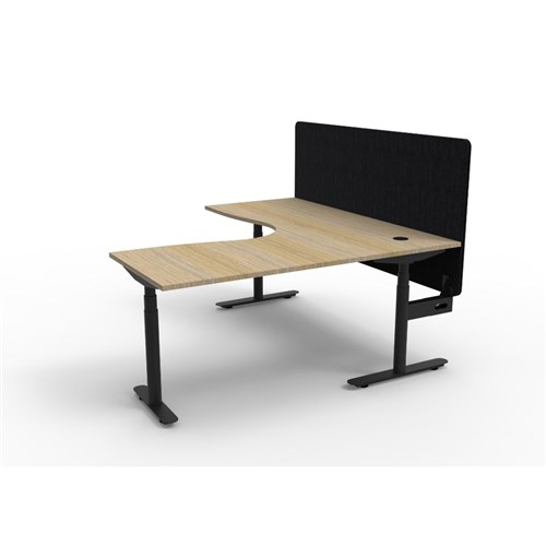 Electric height adjustable corner workstation with Natural Oak top and Black Satin frame, Black Eco screen.