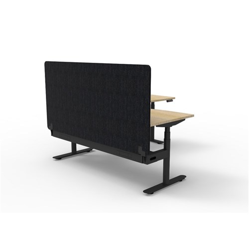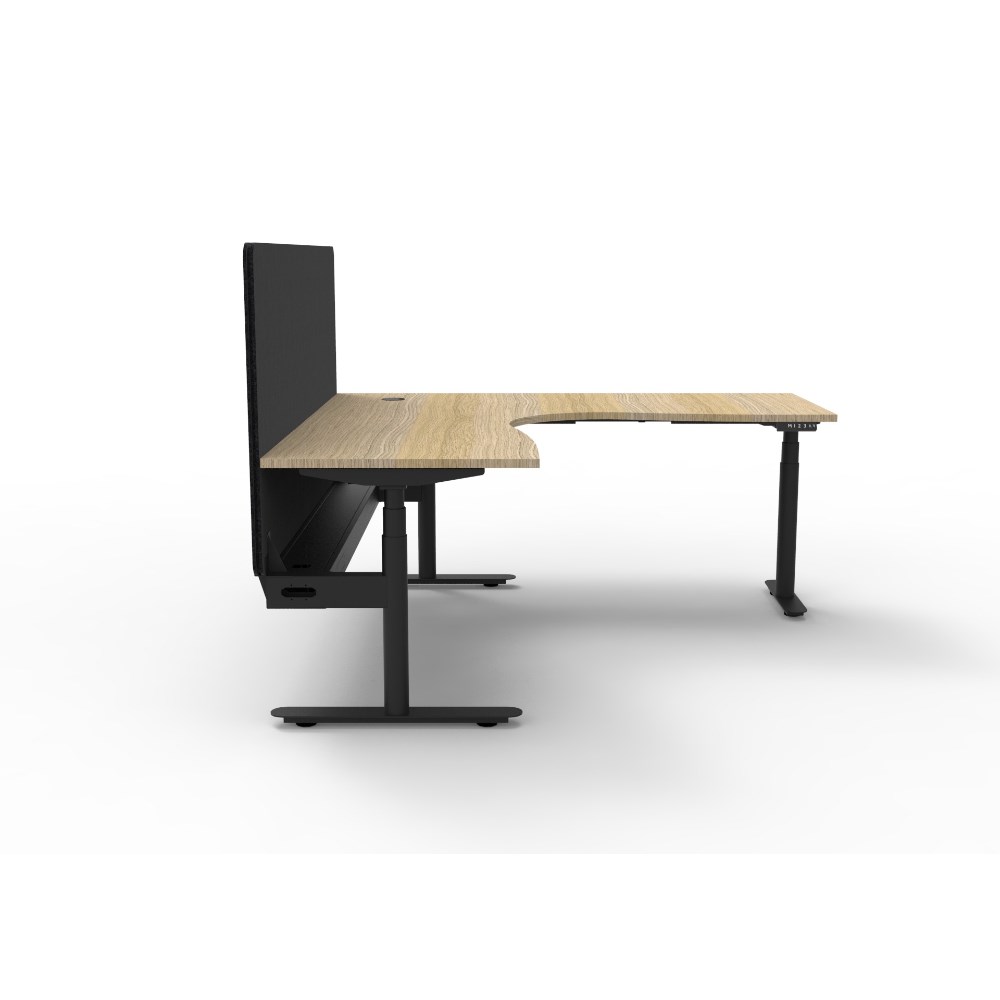 Electric height adjustable corner workstation with Natural Oak top and Black Satin frame, Black Eco screen and cable tray.