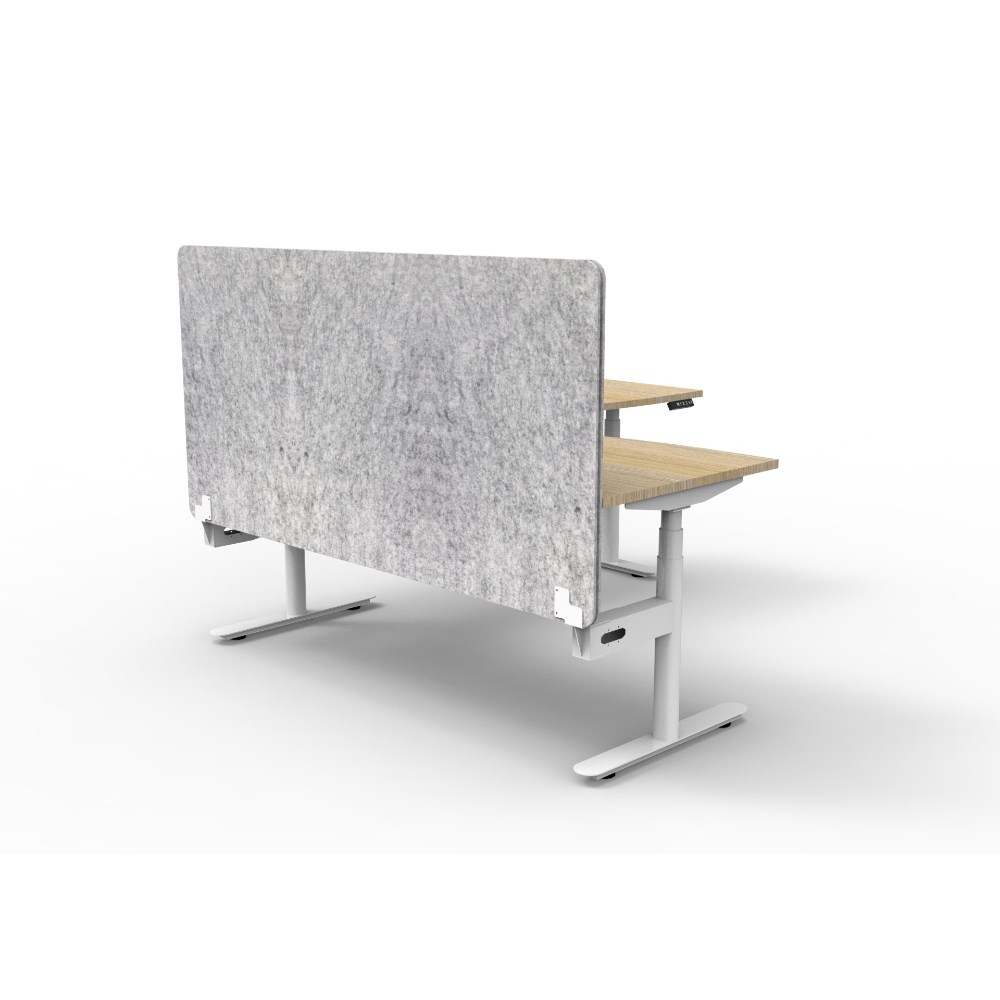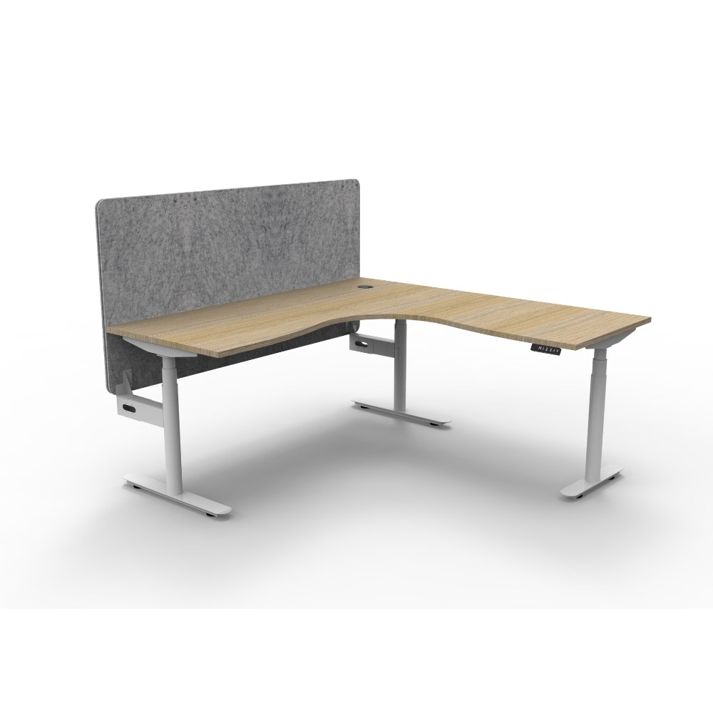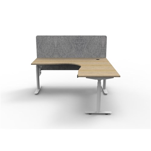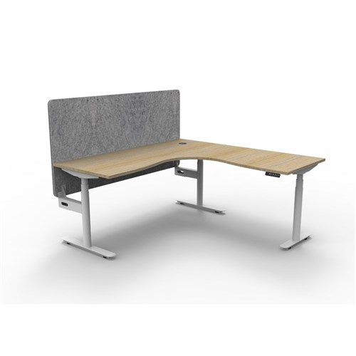 Electric height adjustable corner workstation with Natural Oak top and White Satin frame, Grey Eco screen.
