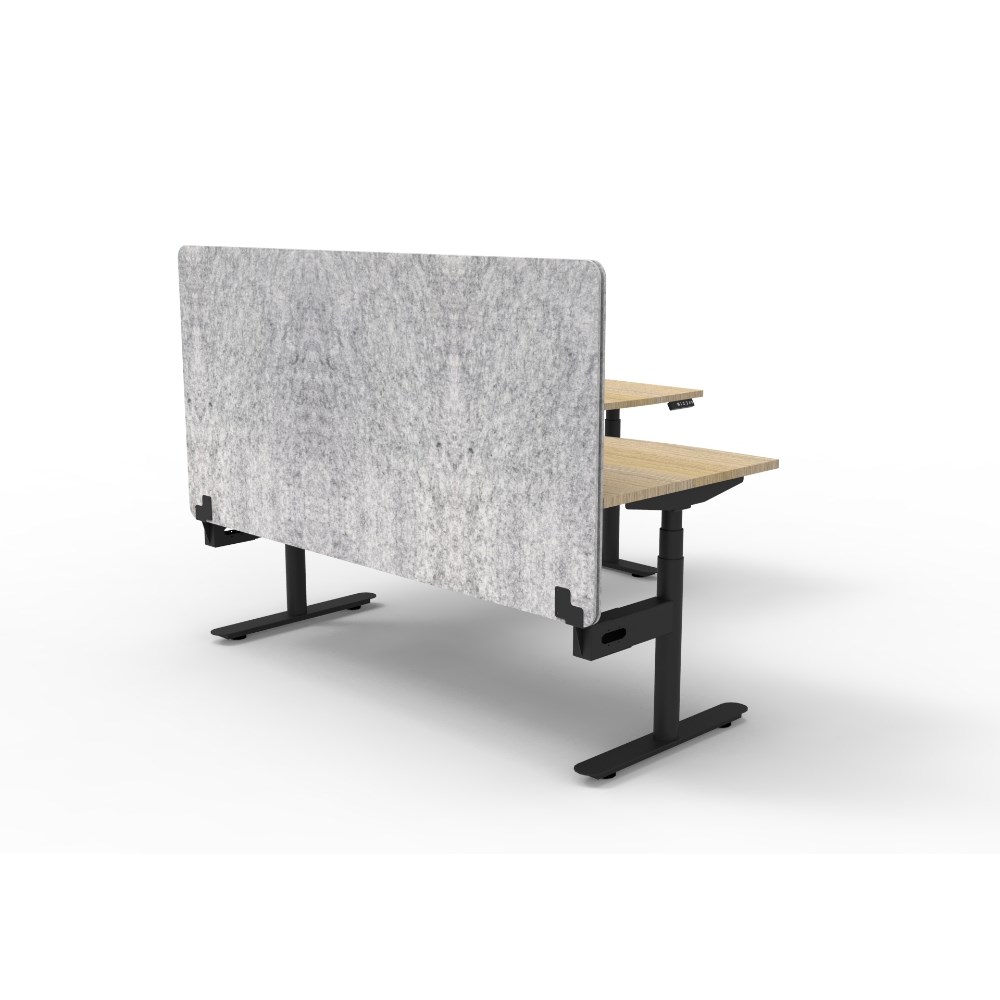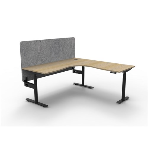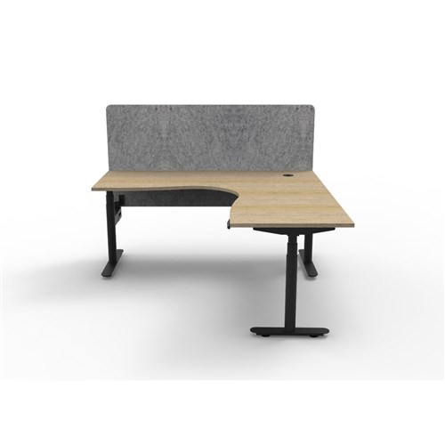 Electric height adjustable corner workstation with Natural Oak top and Black Satin frame, Grey Eco screen.