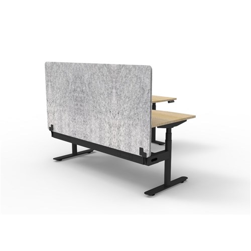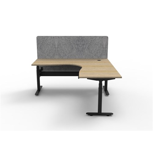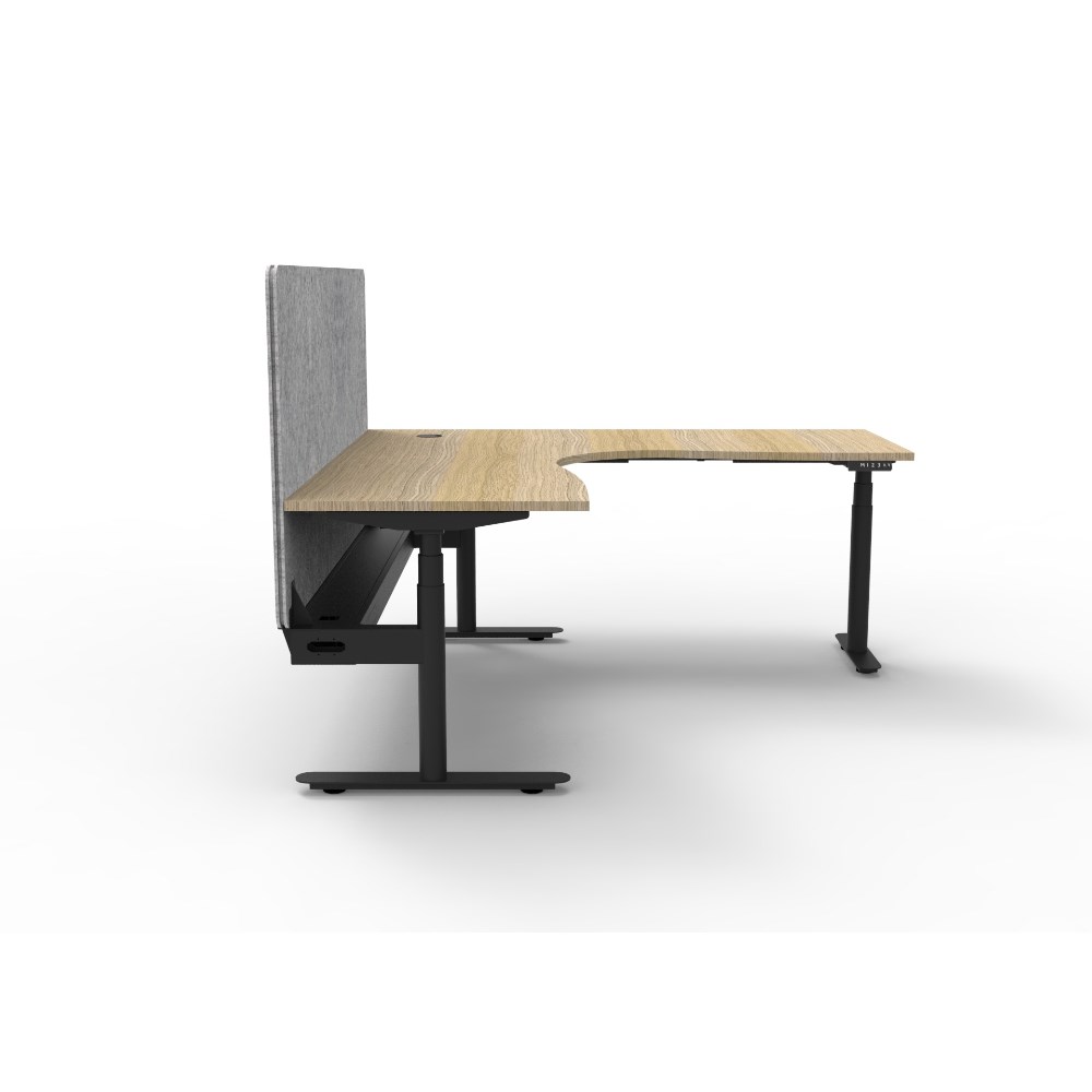 Electric height adjustable corner workstation with Natural Oak top and Black Satin frame, Grey Eco screen and cable tray.