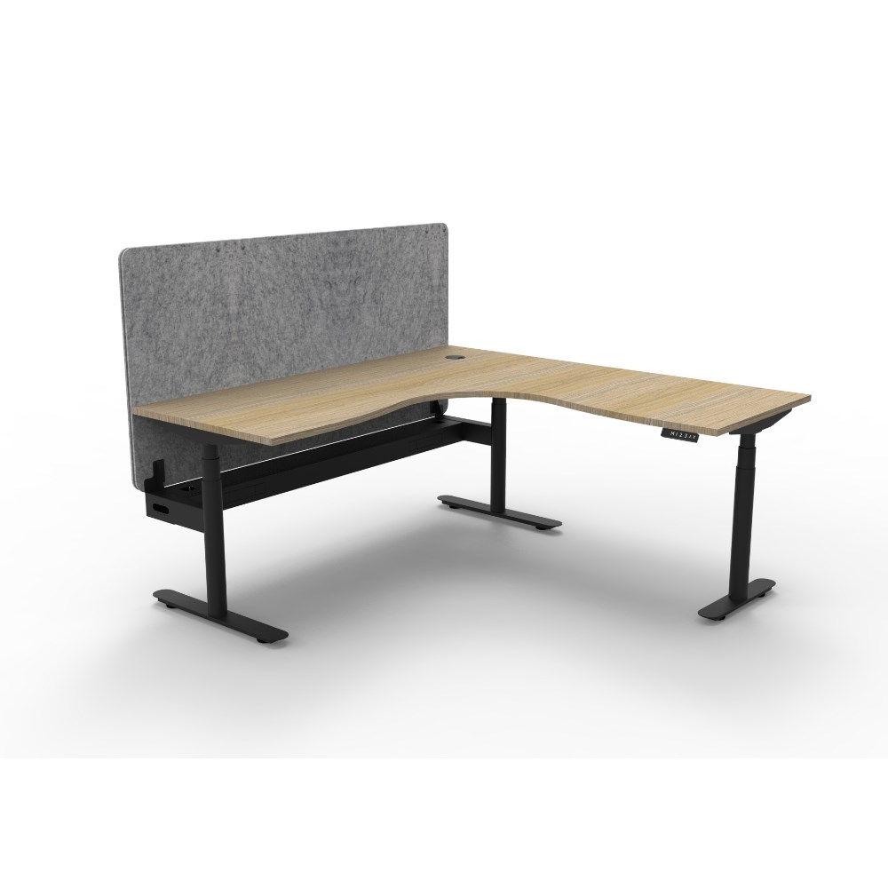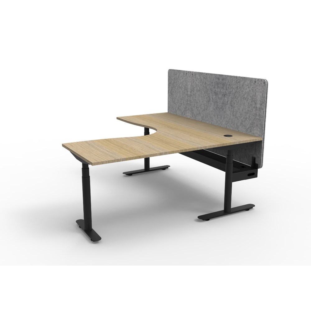 Electric height adjustable corner workstation with Natural Oak top and Black Satin frame, Grey Eco screen and cable tray.