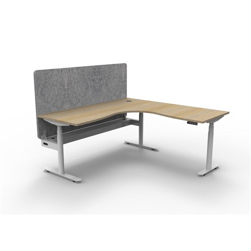 Electric height adjustable corner workstation with Natural Oak top and White Satin frame, Grey Eco screen and cable tray.