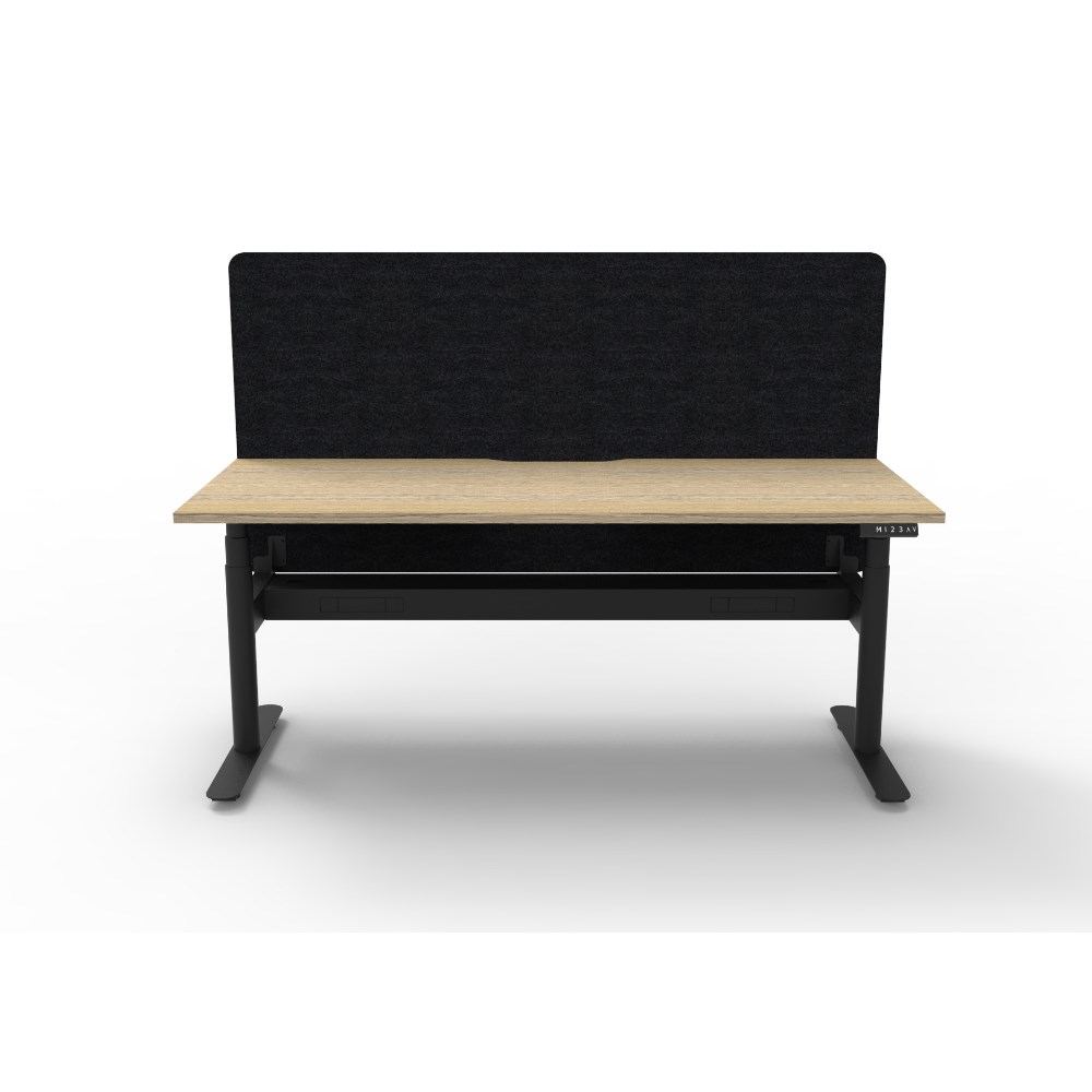 Natural Oak worksurface with rigid edging and 50mm scallop cable cut out. E0 rated 25mm top. Black Satin powder coat round-leg frame. Eco screen and cable tray.