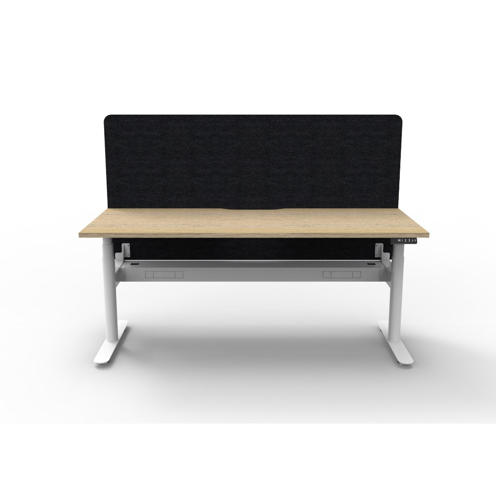 Natural Oak worksurface with rigid edging and 50mm scallop cable cut out. E0 rated 25mm top. White Satin powder coat round-leg frame. Eco screen and cable tray.