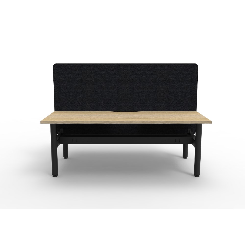 2 person back to back workstation with Natural Oak top and Black Satin frame, Black Eco screen and cable tray.