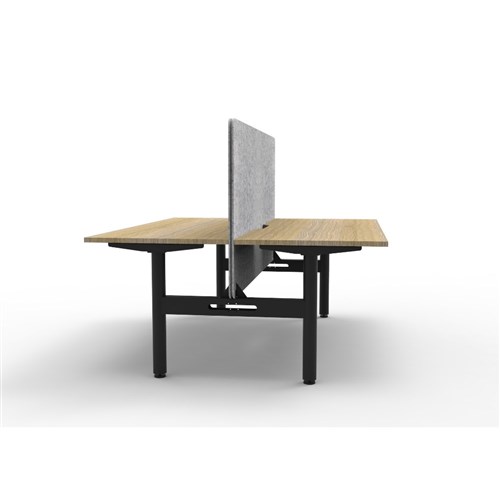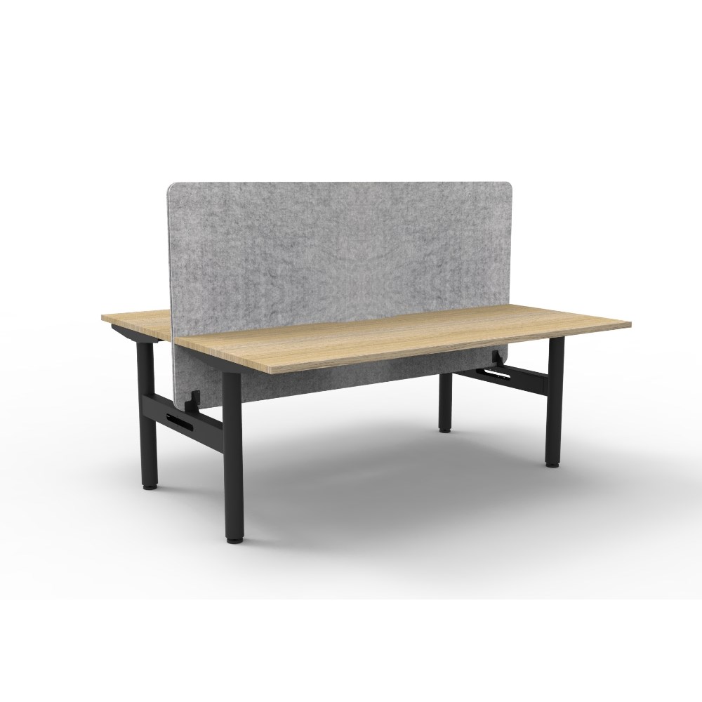 2 person back to back workstation with Natural Oak top and Black Satin frame, Grey Eco screen.