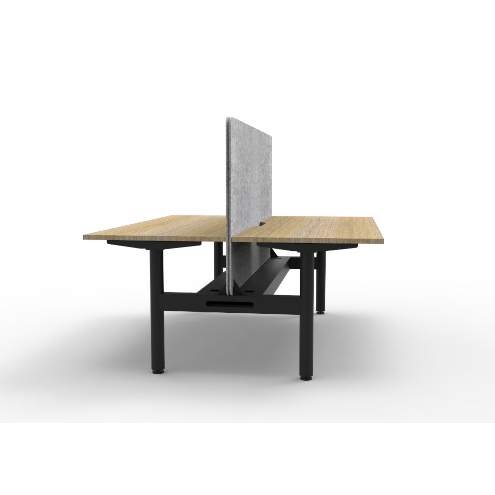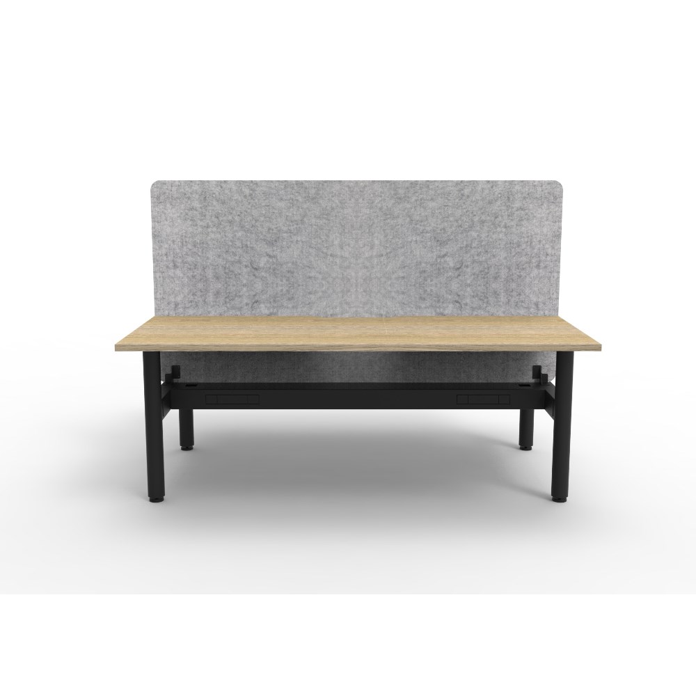 2 person back to back workstation with Natural Oak top and Black Satin frame, Grey Eco screen and cable tray.