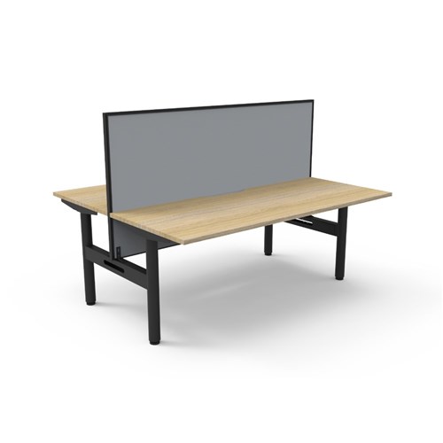 Natural Oak top Black Satin frame. Double sided workstation with screen.
