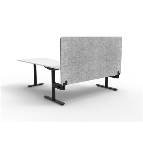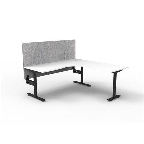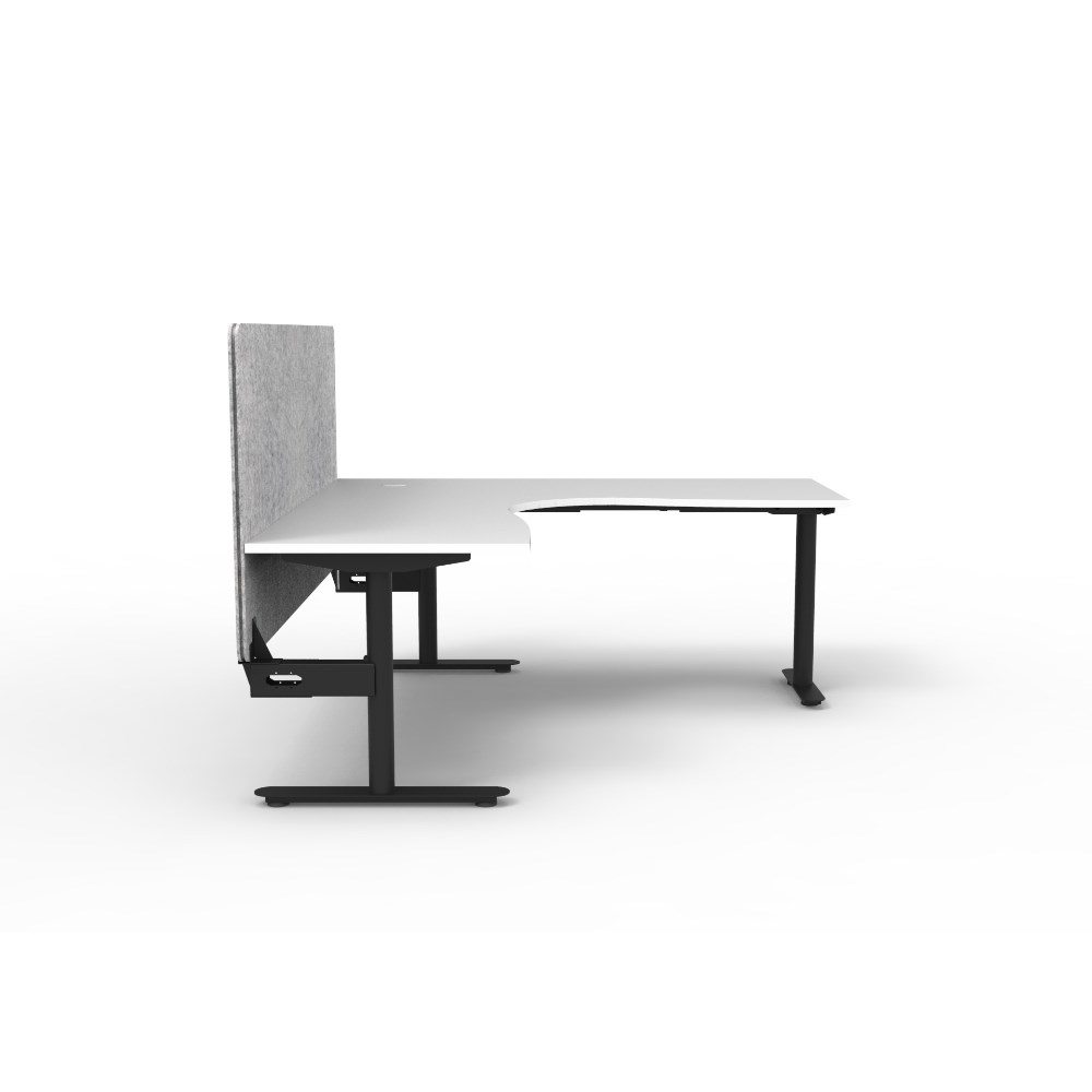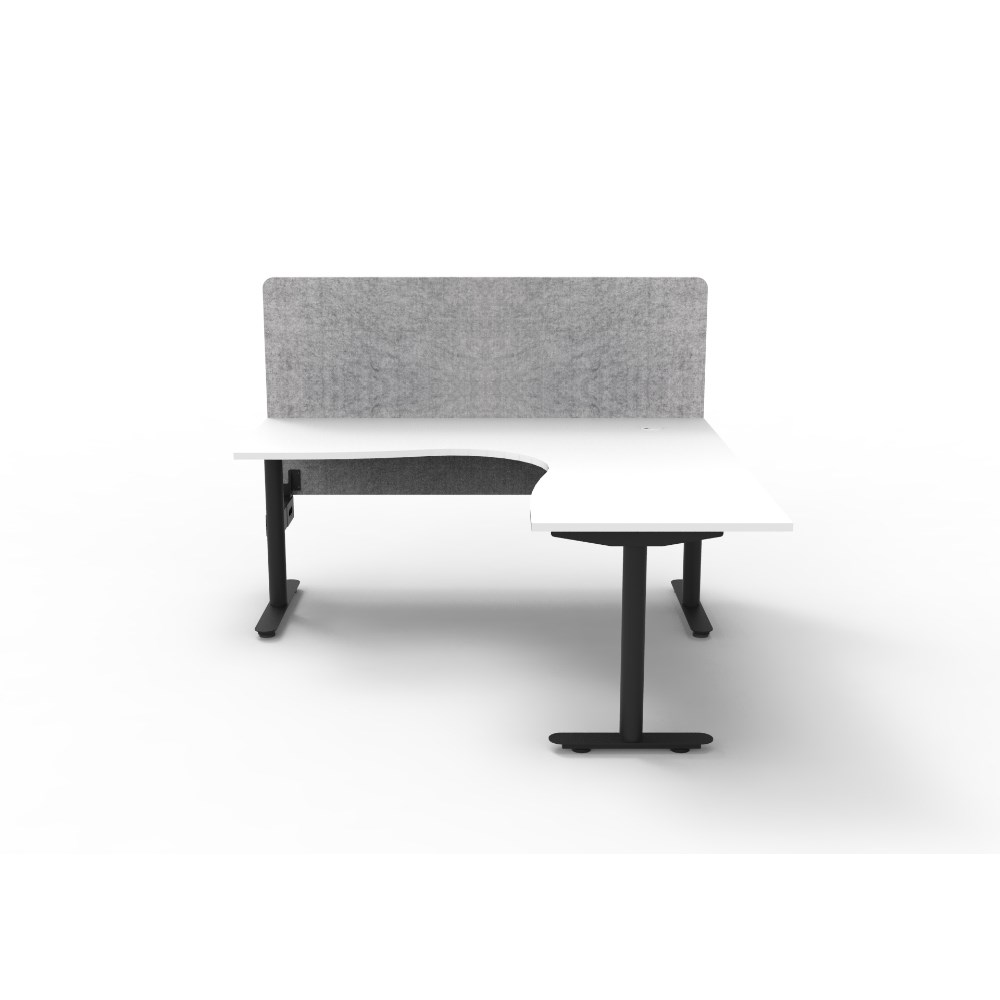 Corner workstation with White top and Black Satin frame, Grey Eco screen.
