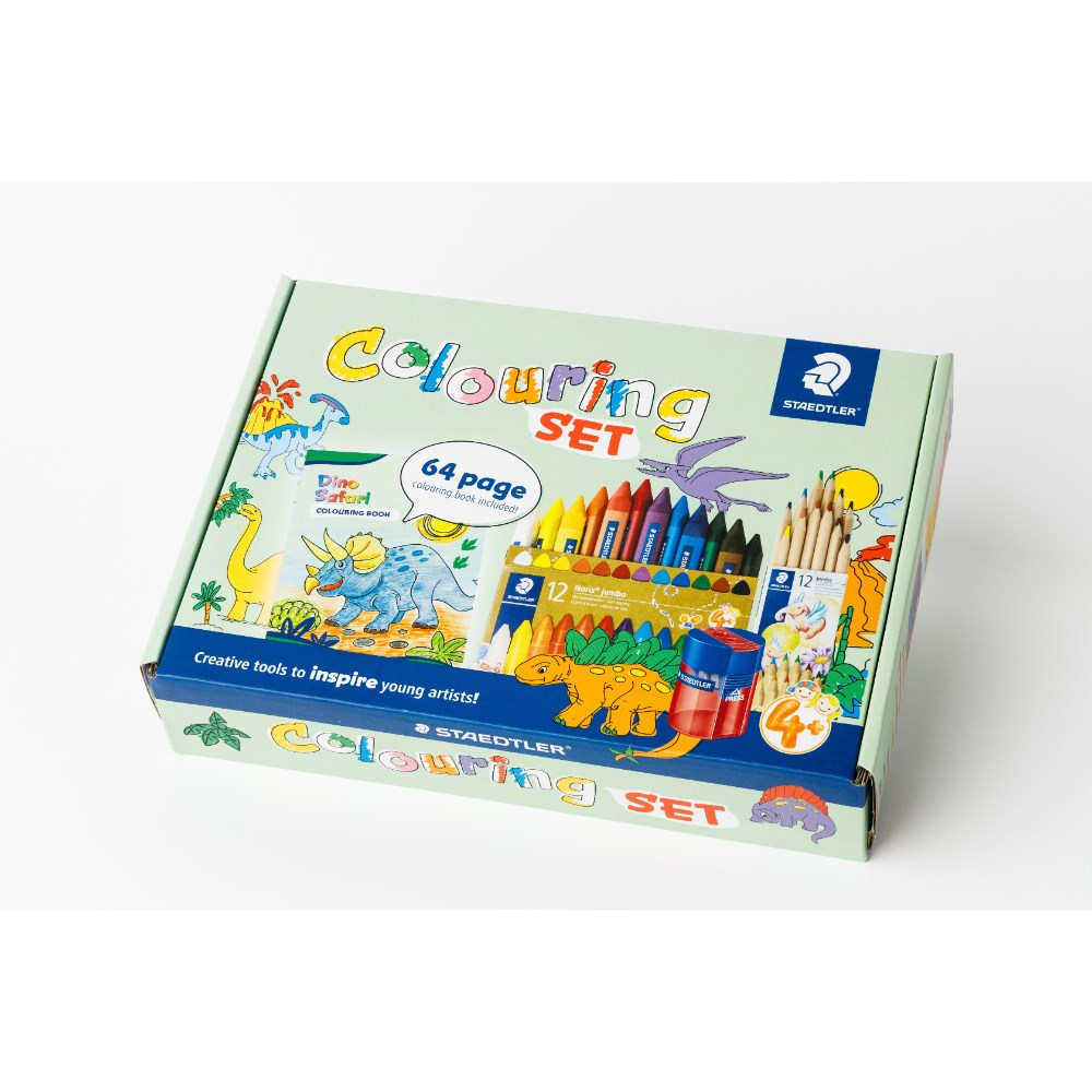 Includes 64 page colouring book, 12 Natural Jumbo Triangular Coloured Pencils, 12 Noris Jumbo Triangular Wax Crayons and 1 Piece Double Hole Tub Sharpener.