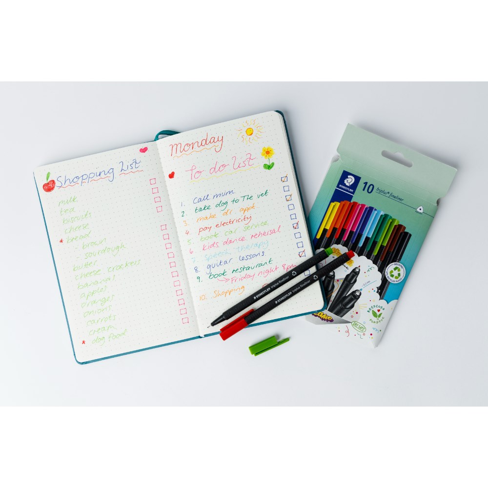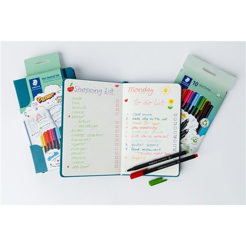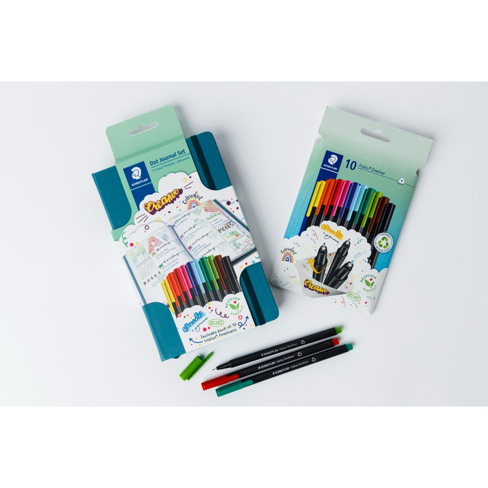 Includes one 192 page dot journal made from premium vegan leather with a pack of 10 Staedtler triplus fineliners in assorted colours.