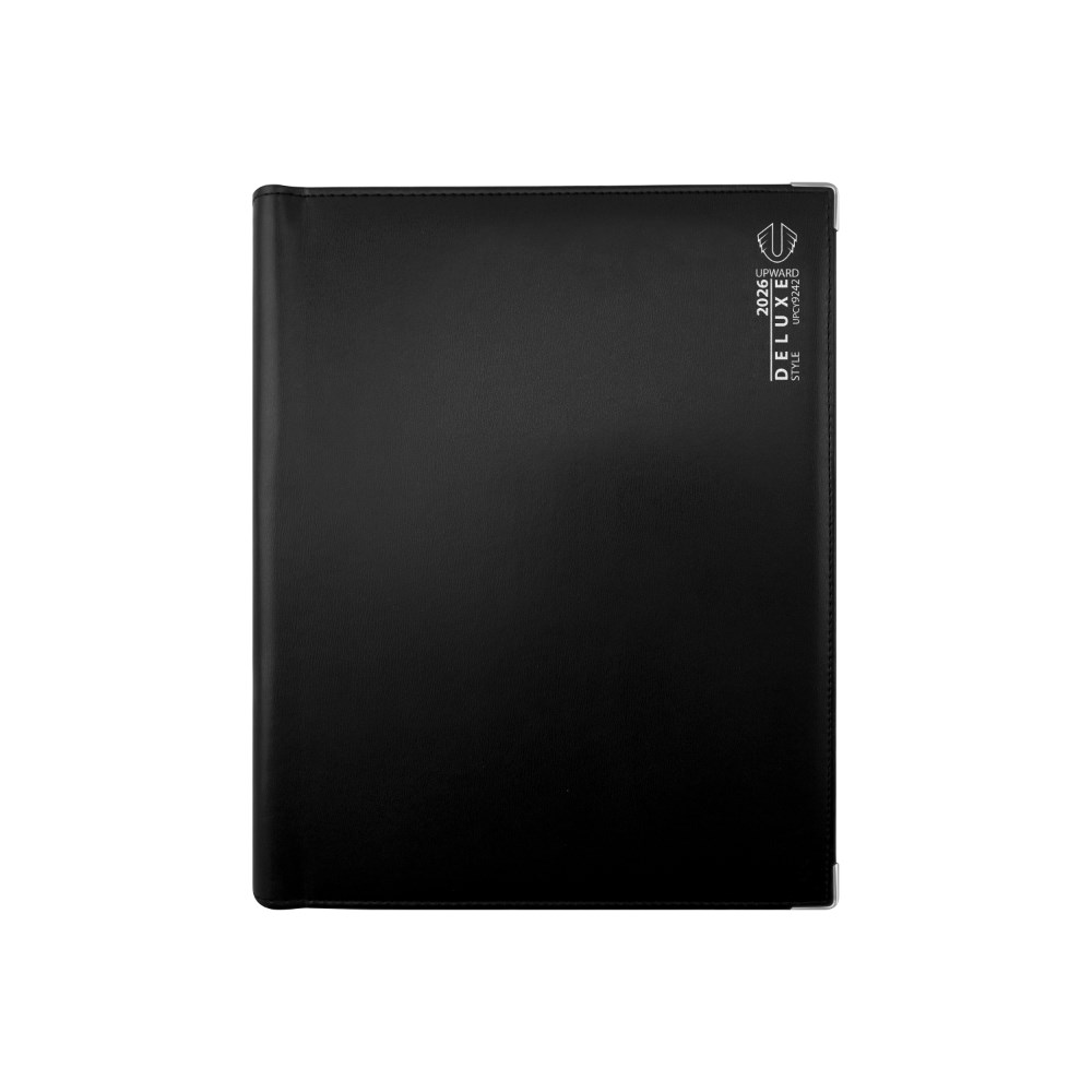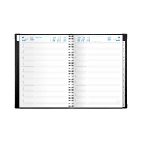 Double wire binding. Lay flat opening. Ribbon marker. Tabs. Translucent pocket.