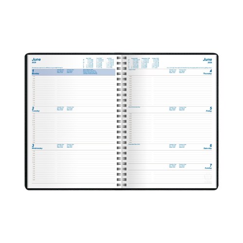 Featuring a padded, phthalate free, PVC cover, pockets for storing business cards and wire-o binding to allow the diary to lie completely flat when open.