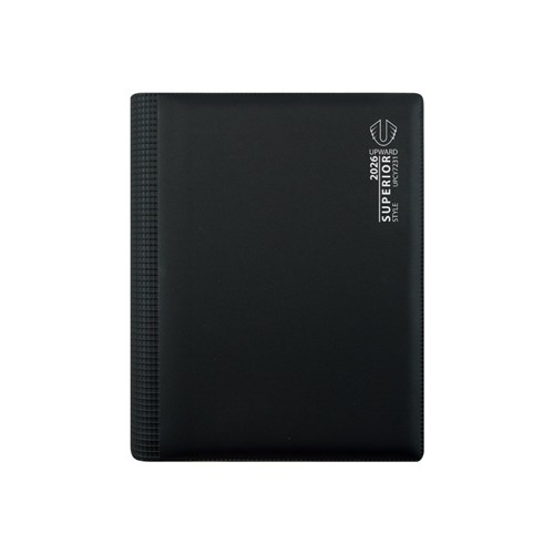 Featuring a padded, phthalate free, PVC cover, pockets for storing business cards and wire-o binding to allow the diary to lie completely flat when open.